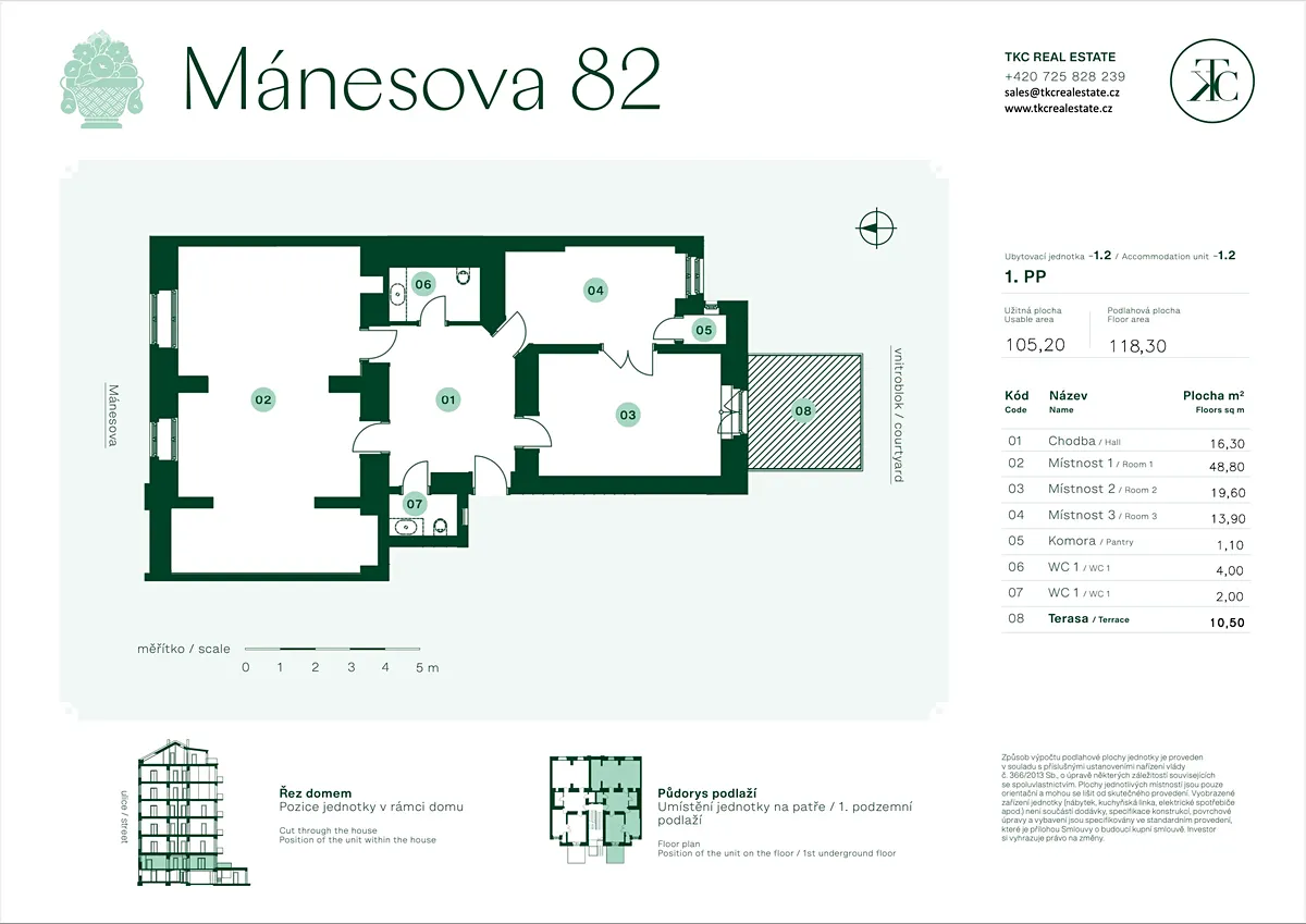 Nabízíme ubytovací jednotku 3+1 o velikosti 116,8 m², situovanou v 1. podzemním podlaží secesního domu po rekonstrukci.
